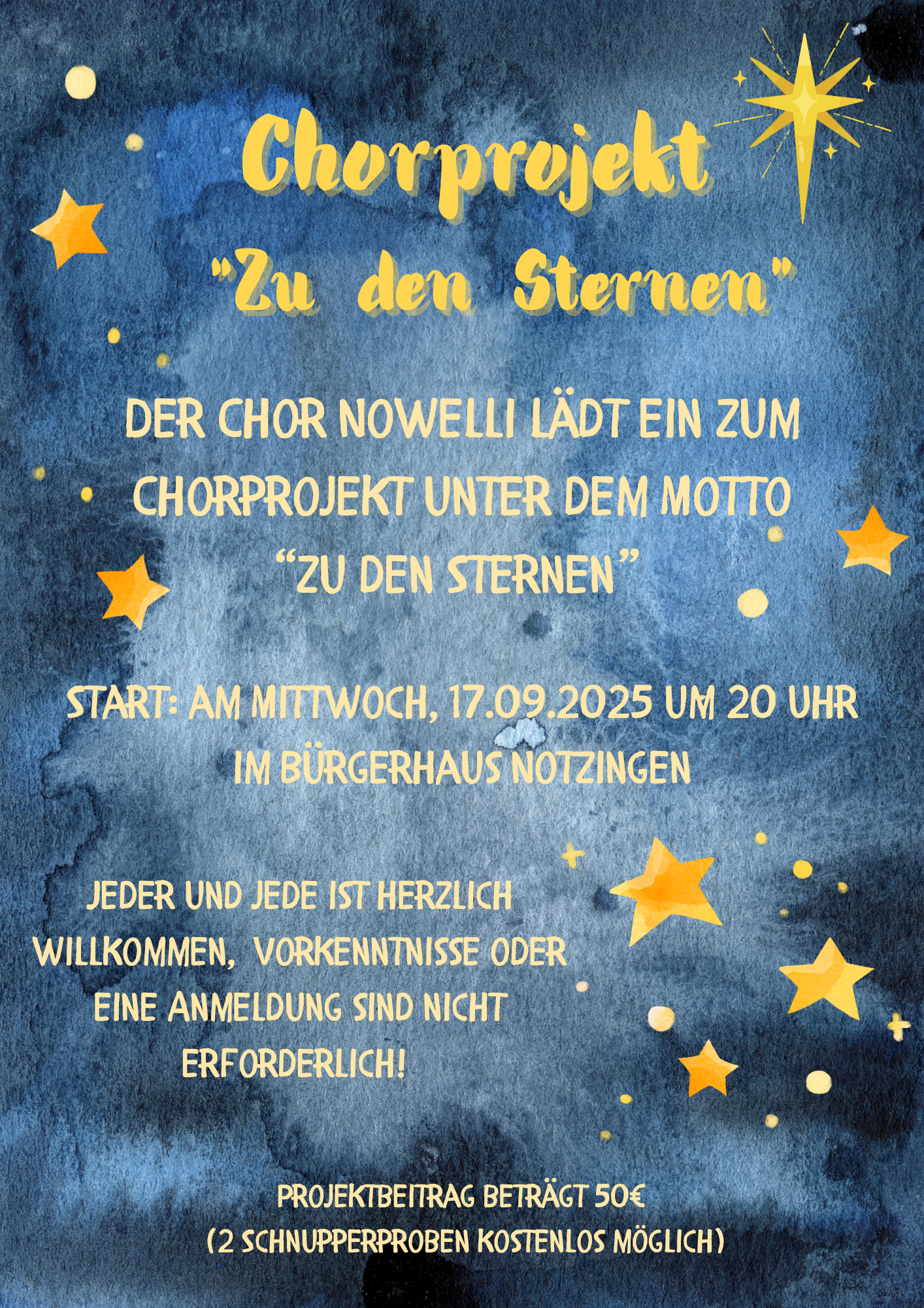 Unter dem Motto „Zu den Sternen“ führt uns das diesjährige Chorprojekt, unter der Leitung von Chorleiterin Sarah Rieker, auf eine Reise vom Stern der Wunder, der hell strahlt und an das Unvorstellbare glauben lässt,bis hin zu den Lichtern, die Dunkelheit erhellen und Hoffnung schenken.